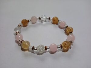 Láska, přátelství , dobrá nálada. Tento náramek obsahuje drahé kameny: Křišťál malý a velký , Turmalín, Růženín ,bílé korálky Preciosa ,malé citrínové rondelky + návlekový materiál Lycra. Podrobnější informace…350 Kč včetně DPH Přidat do košíku -
