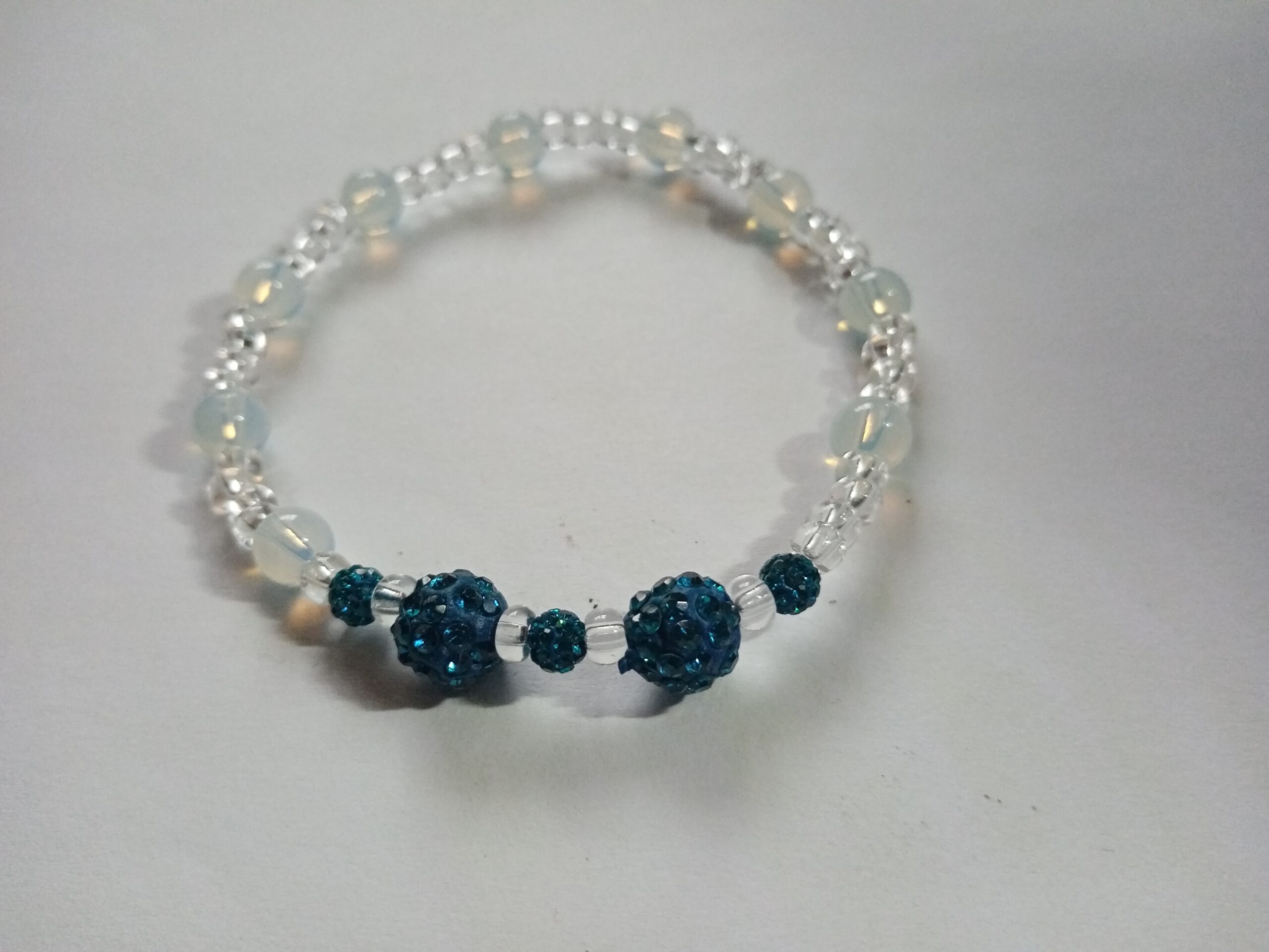 Tento náramek obsahuje: Měsíční kámen, velké a malé štrasové korálky – krásně třpytivé , bílé korálky Preciosa.