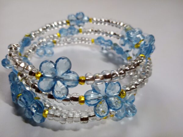 Tento náramek je navlečený na nerezovém drátku ,který obtočíte okolo zápěstí. Může se nosit i na paži. Náramek působí jako skvělý doplněk k oblečení ,do práce, do společnosti, na různé slavnostní akce nebo jen tak, aby vyjádřil momentální náladu, pocit ve kterém se nacházíte. Obsahuje modré čtyřlístky-kytičky, korálky Preciosa modré a žluté.